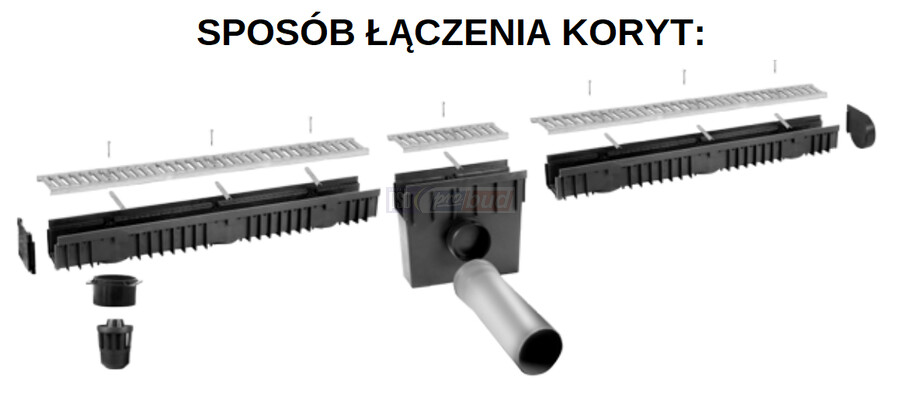 Korpus studzienki podrynnowej posiada odpływ pionowy dla rur kanalizacyjnych o średnicy Ø 110mm. Na ściankach bocznych korpusu znajdują się dodatkowe wytłoczenia na rury kanalizacyjne o średnicy Ø 50; Ø 80; Ø 90; Ø 100; Ø 110mm które w razie potrzeby można wyciąć i podłączyć odpływ boczny.