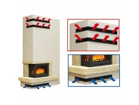 Natomiast gdy kratka otwarta ma być zastosowana do nawiewu chłodnego powietrza do obudowy kominkowej, powinna być instalowana w dolnej części obudowy w taki sposób, aby wewnętrzny otwór wlotu powietrza skierowany był ku górze. Należy zapewnić odpowiedni przepływ powietrza odbierającego ciepło od korpusu wkładu. Wlot zimnego powietrza na dole zabudowy powinien mieć powierzchnię minimum 10 dm2. Powietrze musi opływać swobodnie wkład.