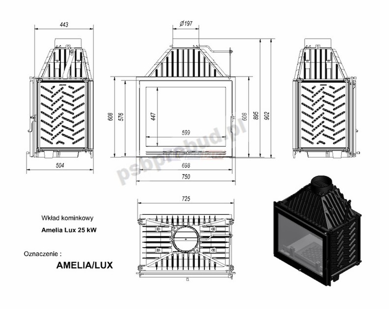 Zaletą wkładu jest korpus wykonany z żeliwa szarego klasy 200,o minimalnej grubości ścianki 8 mm.Front wkładu wykonany z blachy kotłowej o grubości 4mm, przeznaczonej do pracy w podwyższonych temperaturach. Gęsto rozmieszczone radiatory, zwiększające powierzchnię wkładu,czyli obszar, którym oddawane jest ciepło do otoczenia. Wbudowany został szyber, który pozwala na regulację ciągu komina oraz deflektor, który wydłuża drogę spalin. W drzwiczkach zamontowana jest ceramika żaroodporna wytrzymująca temperaturę do 800oC. Regulacja dopływu powietrza poprzez popielnik.Gwarancja 5 lat.