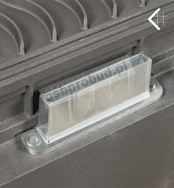 Zaletą wkładu jest korpus wkładu wykonany z żeliwa szarego klasy 200, o minimalnej grubości ścianki 8 mm, front pieca ze stali kotłowej. Gęsto rozmieszczone radiatory, zwiększające powierzchnię wkładu,czyli obszar, którym oddawane jest ciepło do otoczenia oraz deflektor, który wydłuża drogę spalin. W drzwiczkach zamontowana jest ceramika żaroodporna wytrzymująca temperaturę do 800oC. Dzięki podnoszonym i opuszczanym drzwiczkom łatwo załadujemy żądaną ilość drewna a mechanizm umożliwiający boczne otwarcie drzwiczek ułatwi czyszczenie szyby. System unoszenia drzwi został zbudowany w oparciu o przeciwciężar z linką stalową pracujący na łożyskowanym bloczku w prowadnicach, co umożliwia cichą i bezawaryjną pracę. Szyba boczna dzielona - wkład kominkowy z dwoma szybami zestawionymi ze sobą pod kątem prostym (szyby łączone bez szprosa). Regulacja dopływu powietrza poprzez popielnik. Gwarancja 5 lat.